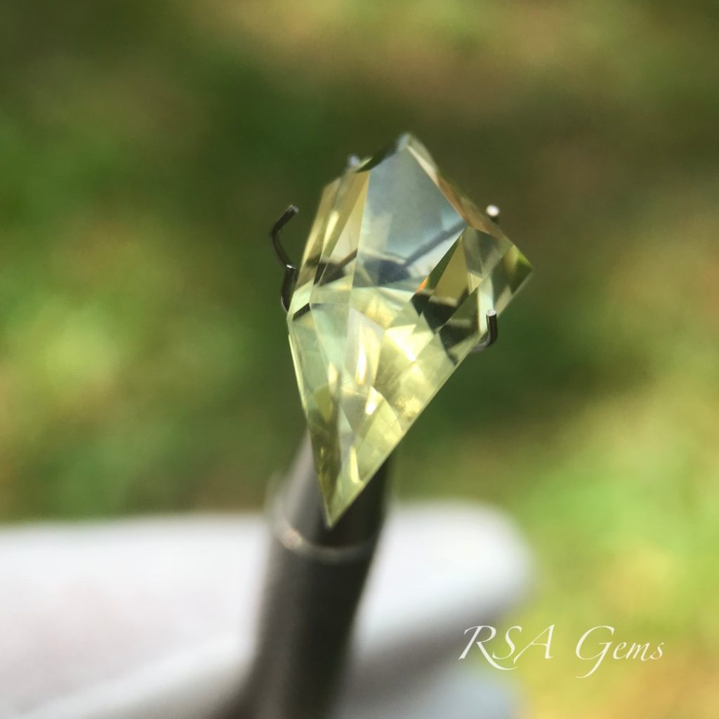 This freeform heliodor was designed by Loren Brown for an unusual shaped piece of rough. Intriguing shape, beautiful stone, but that point is very sharp and will require a custom setting to protect it.