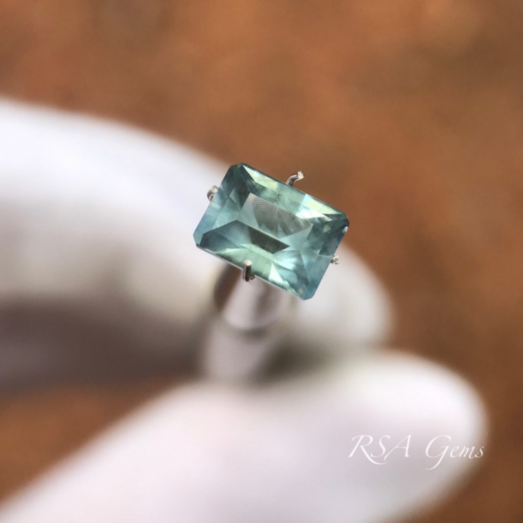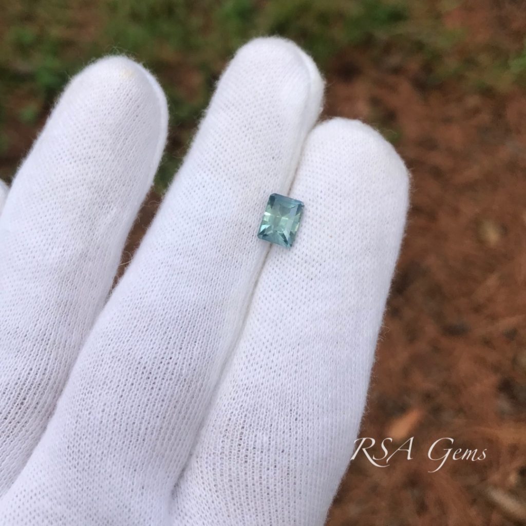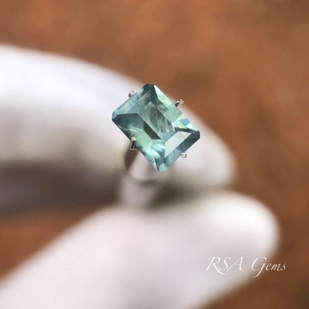The main photo reflects the steel blue color of this stone. The largest photo shows a beautiful blue, but only in the right conditions. This is true of most gemstones, they will change their appearance with changes in light. So if you ask “Which photo shows its true color” I will answer “All of them.” However, the standard is to examine the stone under daylight conditions facing north with a pure white background, which is what we do when we color grade them.