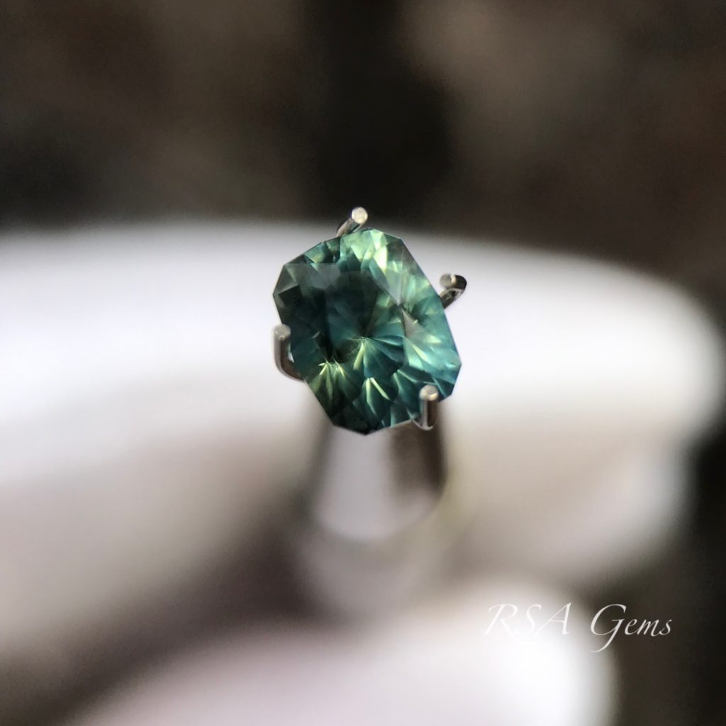 This sapphire came from the same rough as our much larger yellow sapphire listed here. It is yellow and blue, and they have mixed somewhat to show a greenish hue with a hint of yellow and some blue. Pretty stone with high brilliance.