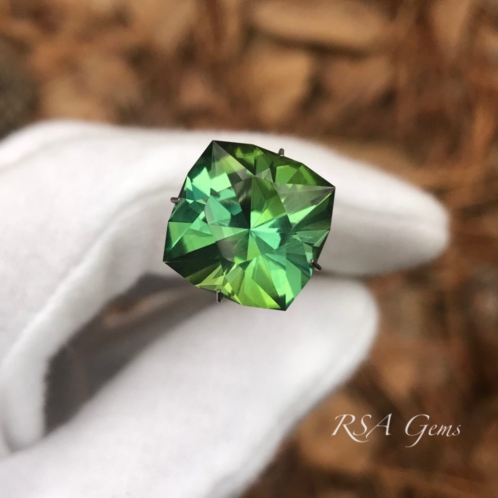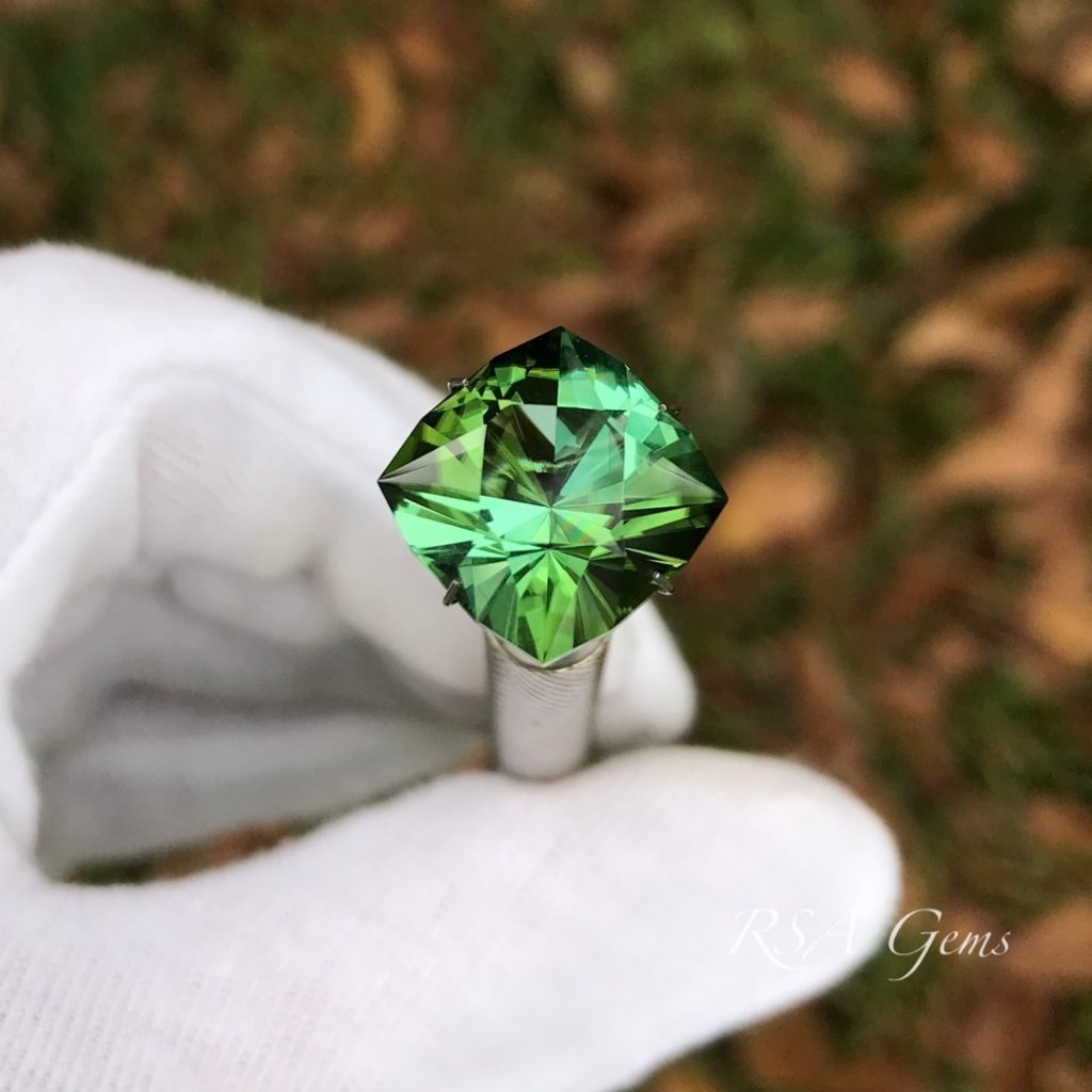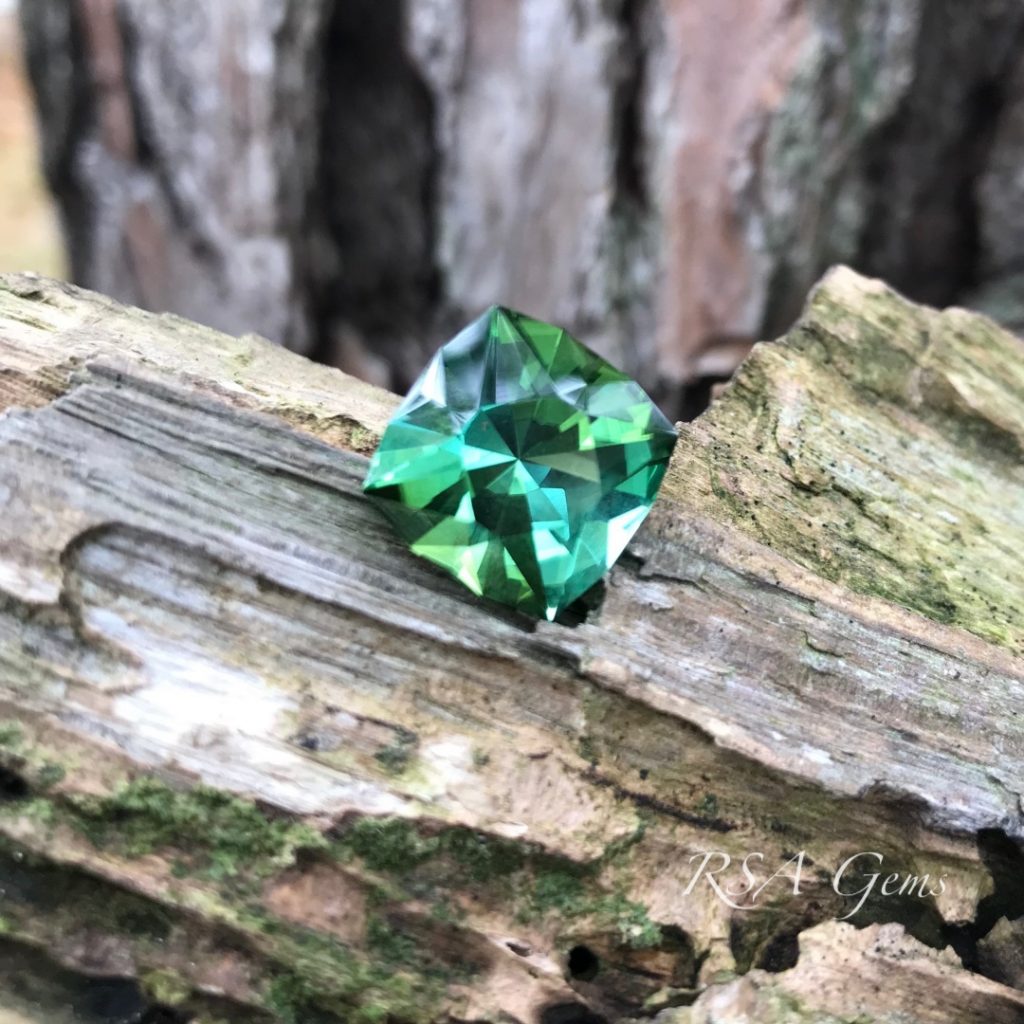 The facet rough of this beautiful tourmaline came from deep in the jungle of The Congo in Africa. Half the stone is bluegreen and half is an “apple green” with the color alternating between quadrants; cut in a square cushion design called “Rhapsody in Green.”