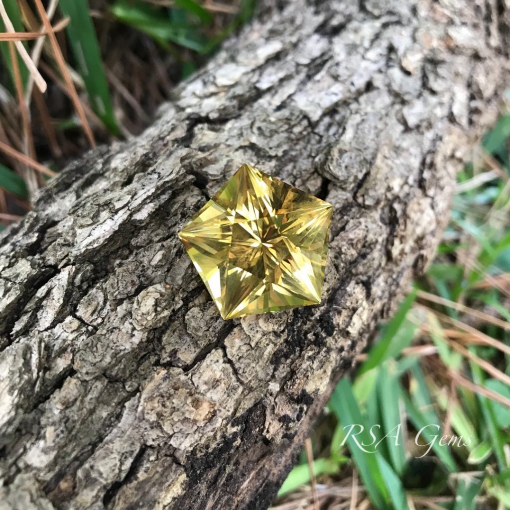 This natural untreated Citrine was mined in Nigeria and cut into Loren’s “Triple Star” faceting pattern. Beautiful, flawless stone with nice deep color and a lot of fire!