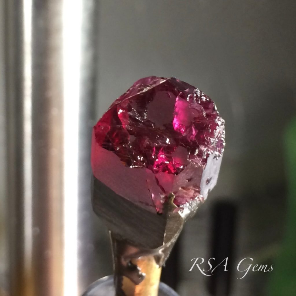 Rubellite is the red variety of tourmaline. This gem is a top-color, deep vivid red. The color is highlighted by the double-layer of crown facets in this design. Tourmaline is always dichroic, and Rubellite is no exception. This stone displays vivid pink flashes as a result of dichroism. Here lies a stunning alternative to the more expensive Ruby (and you cannot tell the difference without scientific investigation).